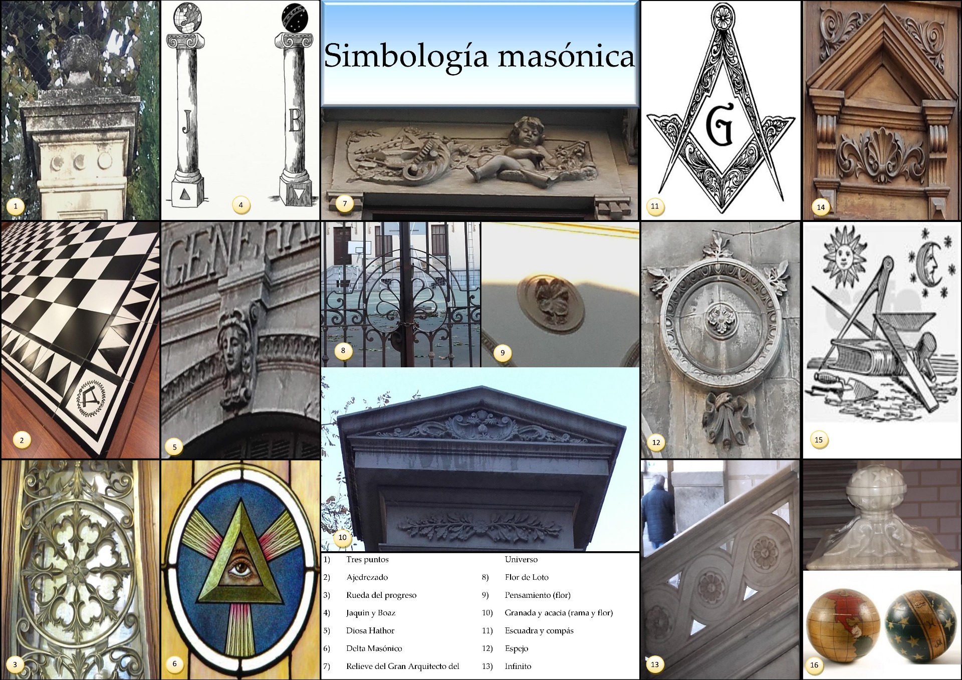 Una vez visto un pequeño resumen de la historia de la Masonería, podemos adentrarnos en la simbología que esta sociedad utiliza para dar a conocer su presencia a los iniciados o a los simples entendidos en la materia. Este artículo nos resultará útil para reconocer un edificio ligado directa o indirectamente a la Masonería en cualquier ciudad, y evidentemente Granada no es una excepción. He aquí una selección de los principales símbolos que vamos a encontrar en nuestra ruta.